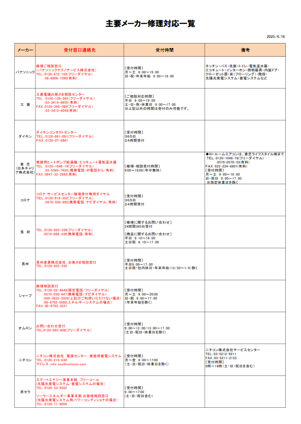 各メーカーお問い合わせ先